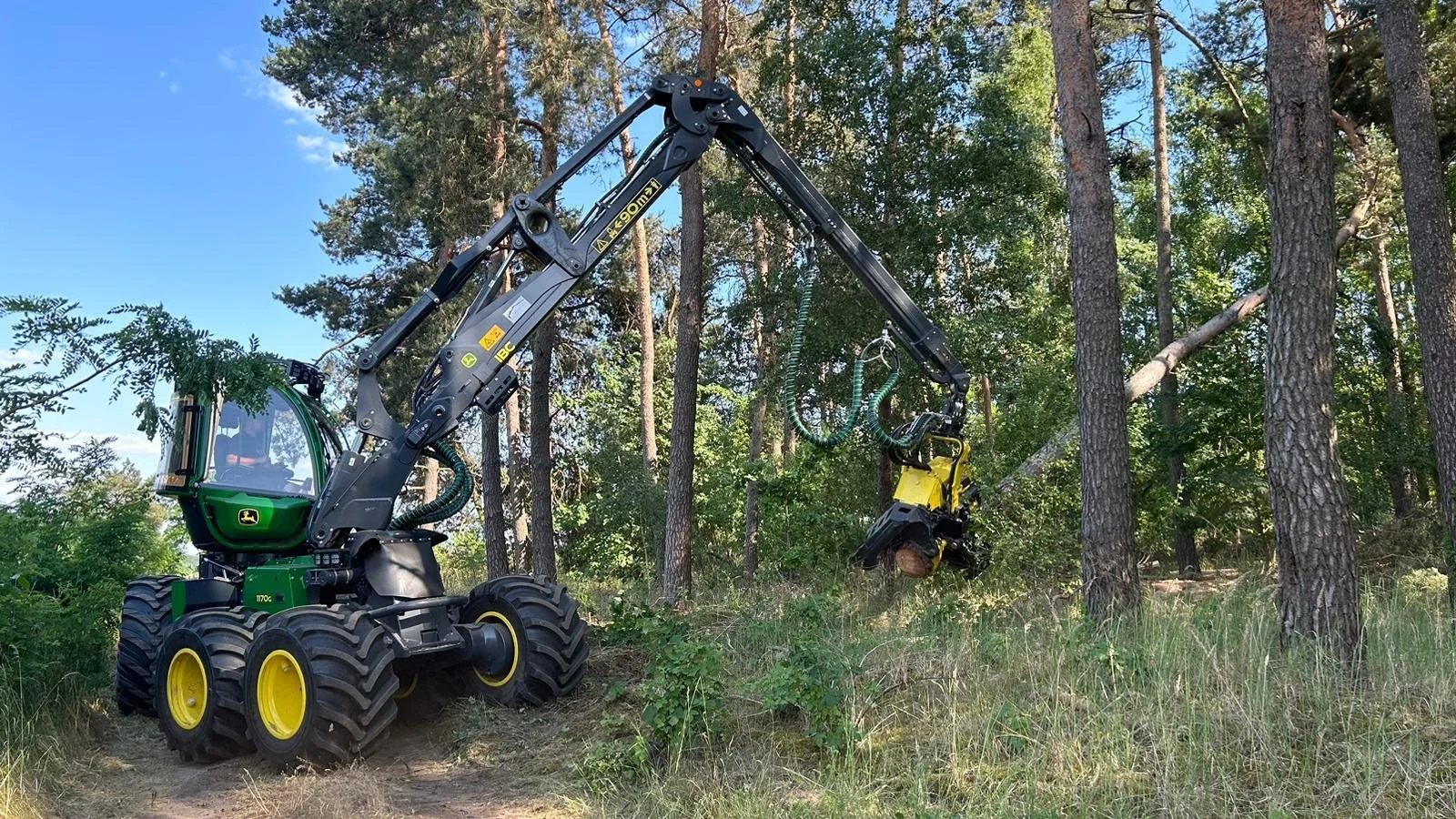 John Deere 1270G (8-Rad): Ideal für anspruchsvolles Gelände und größere Bäume. Die höhere Tragfähigkeit und Kranreichweite sichern maximale Produktivität.
